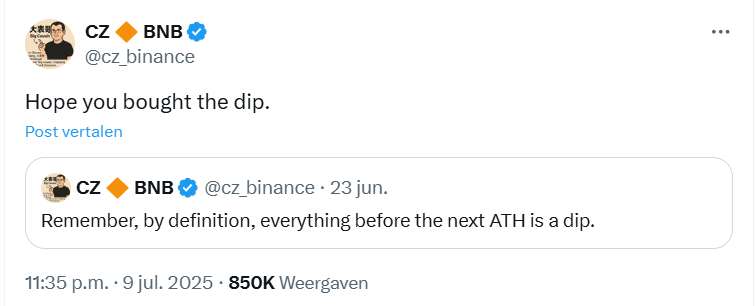 Ook Changpeng Zhao, beter bekend als CZ, liet van zich horen. Hij was tot voor kort de baas van Binance, een groot handelsplatform voor crypto. In zijn bericht schreef hij: “Hopelijk heb je de dip gekocht.” Daarmee bedoelt hij dat alles wat vóór de all time high kwam, een goed koopmoment was.