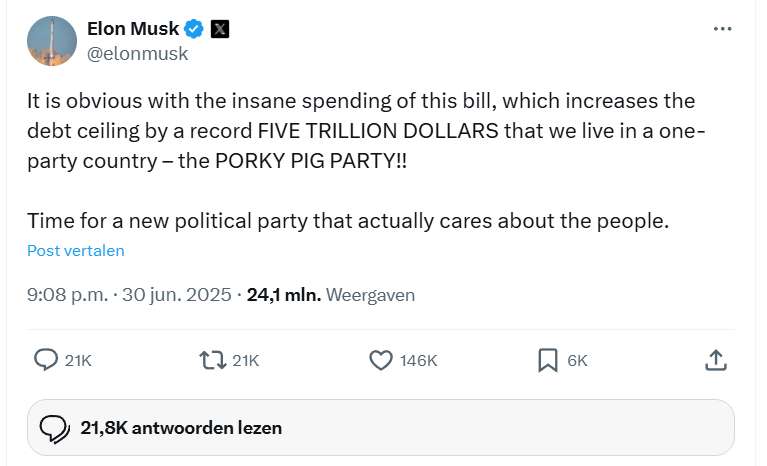 Elon Musk vindt dat het plan van Trump om meer geld te lenen gevaarlijk is. Hij zegt dat toekomstige generaties daar veel last van krijgen. Musk dreigt daarom een nieuwe partij op te richten, de America Party.