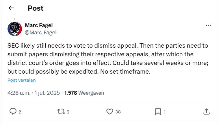 De XRP rechtszaak update maakt duidelijk dat de SEC nog niet zover is dat ze haar beroep kan intrekken. Volgens Marc Fagel moet de toezichthouder eerst stemmen over het terugtrekken van het beroep.